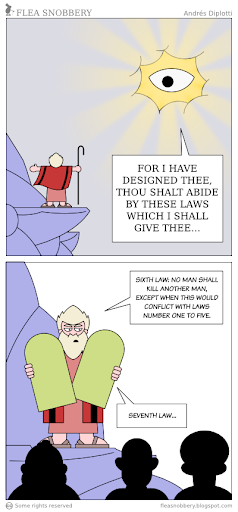 "Sixth law: no man shall kill another man, except when this would conflict with laws number one to five. Seventh law..."